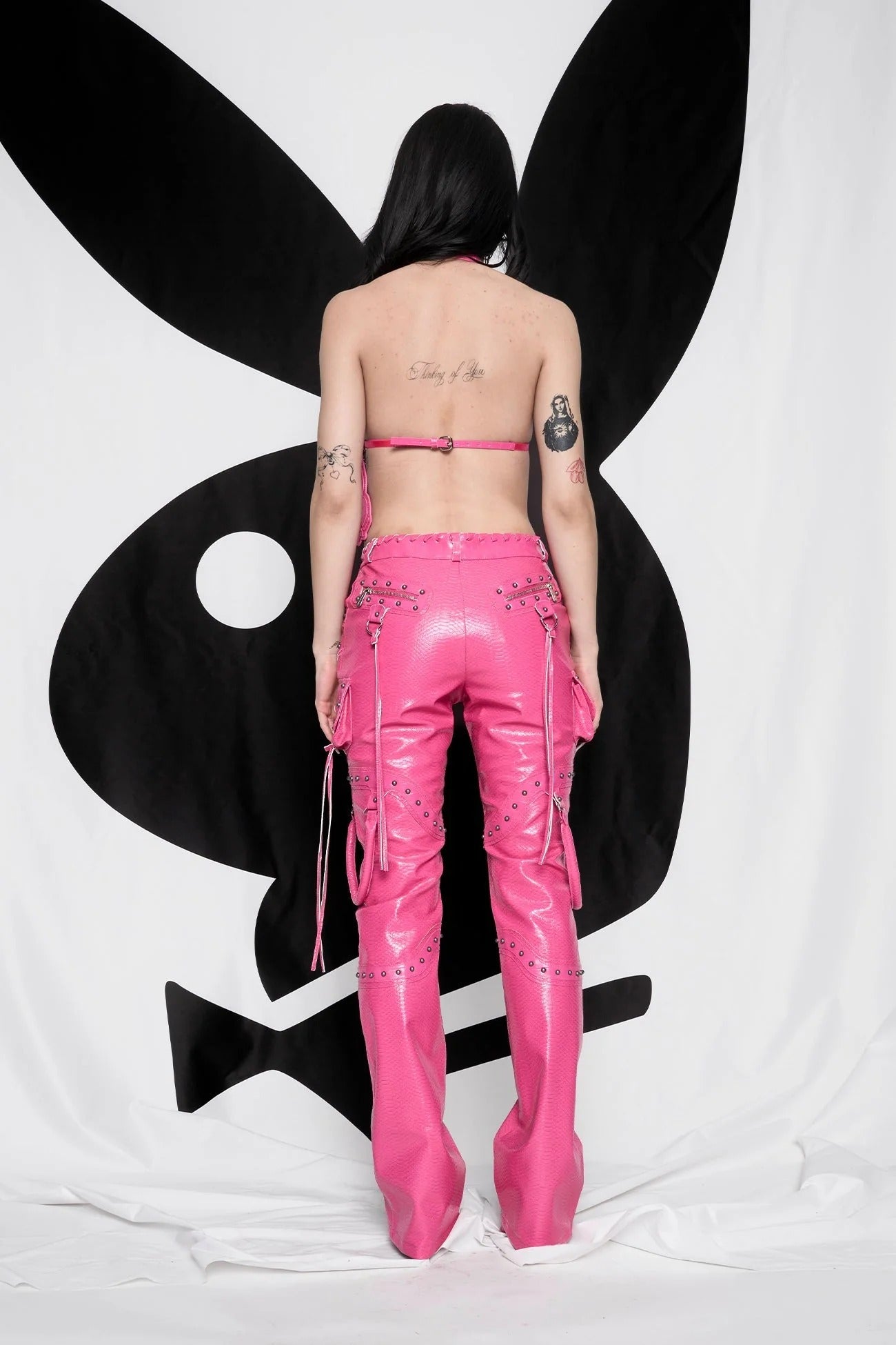 Inspired by vintage handbags and the Y2K aesthetic, this top from the Playboy x Namilia collection features bold details like straps, buckles, rivets, and textured animal skins made from vegan materials. It's adorned with charms: the iconic Playboy bunny and a Namilia logo keychain.