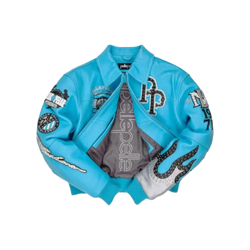 Oversize’owa grafika na plecach, rozciągająca się od rękawa do rękawa, łączy wielowarstwowe skórzane elementy, metaliczny nadruk, ćwieki oraz cyrkonie, podkreślając legendarny charakter marki. Detale takie jak skórzany kołnierz, oraz dedykowany suwak z logo Pelle Pelle dopełniają luksusowego stylu streetwear.