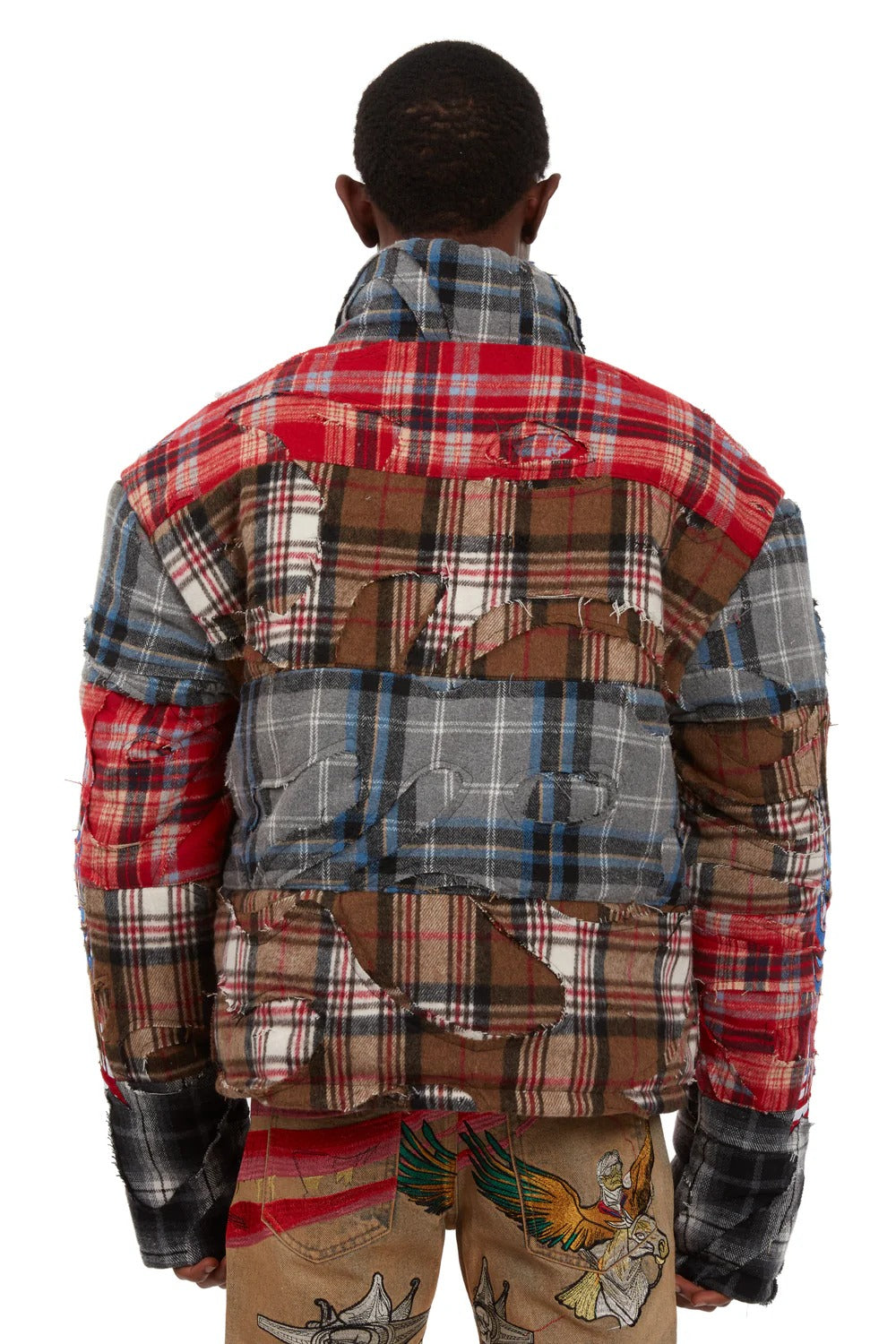The Ruin Flannel from Who Decides War by MRDR BRVDO is a designer flannel shirt made of 100% cotton. It's constructed from distressed and repaired flannel panels, giving it a raw, layered look inspired by high-end streetwear aesthetics.