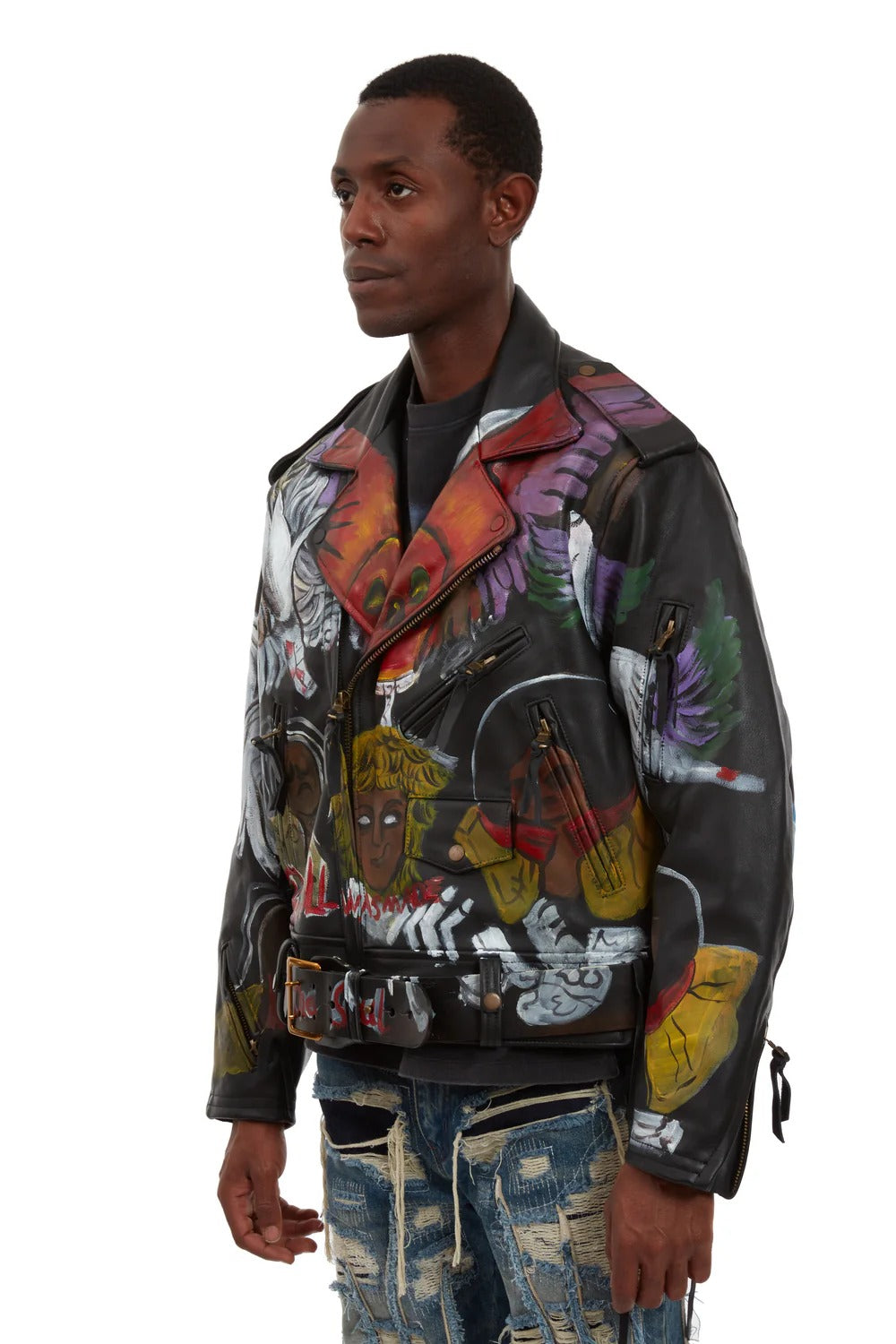The distressed leather effect combined with the hand-applied pattern gives each jacket a distinctive, collectible look with a high-end streetwear aesthetic.